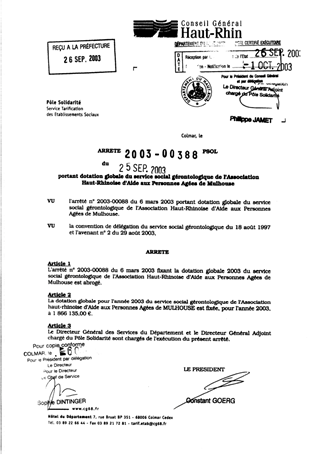 portant dotation globale du service social gérontologique de l'Association Haut-Rhinoise d'Aide aux personnes âgées de MULHOUSE. Resumé Pièces jointes ARRETE Assemblée : Non défini Date : 25/09/2003 Rapporteur : Non défini Collectivité : Conseil départemental du Haut-Rhin Direction : Non défini Service : Service de la Tarification des Etablissements Domaine : Dotations financières Commission :