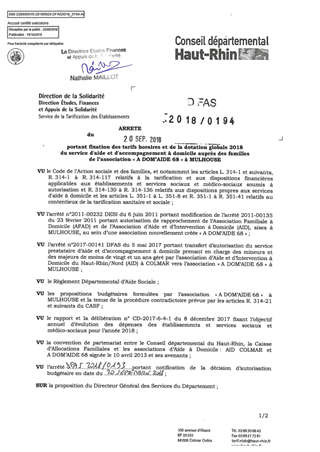 portant fixation des tarifs horaires et de la dotation globale 2018 du service d'aide et d'accompagnement à domicile auprès des familles de l'association "A DOM'AIDE 68" à MULHOUSE Resumé Pièces jointes ARRETE Assemblée : Non défini Date : 20/09/2018 Rapporteur : Non défini Collectivité : Conseil départemental du Haut-Rhin Direction : Non défini Service : Direction de la Solidarité Domaine : Dotations financières Commission :