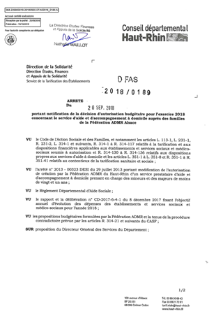 portant notification de la décision d'autorisation budgétaire pour l'exercice 2018 concernant le service d'aide et d'accompagnement à domicile auprès des familles de la fédération ADMR Alsace Resumé Pièces jointes ARRETE Assemblée : Non défini Date : 20/09/2018 Rapporteur : Non défini Collectivité : Conseil départemental du Haut-Rhin Direction : Non défini Service : Direction de la Solidarité Domaine : Dotations financières Commission :