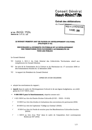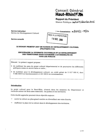 Le présent rapport propose :  de confirmer les axes du projet culturel départemental et de poursuivre les différentes politiques mises en œuvre dans ce cadre ;  de mobiliser pour le développement culturel, un crédit global de 5 017 000 €, dont 4 686 000 € en fonctionnement et 331 000 € en investissement.