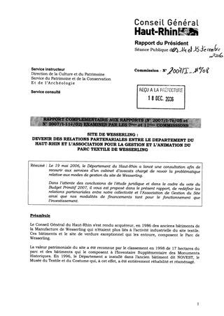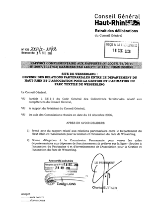Rapport complémentaire aux rapports (n° 2007/I-7e /05 et n° 2007/I-11e /02) Site de Wesserling : devenir des relations partenariales entre le Département du Haut-Rhin et l'Association pour la gestion et l'animation du Parc Textile de Wesserling