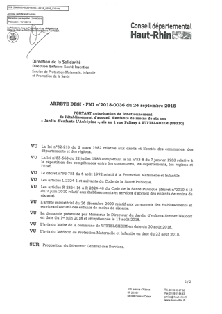 portant autorisation de fonctionnement de l'établissement d'accueil d'enfants de moins de six ans "Jardins d'enfants L'Aubépine", sis au 1 rue Palissy à WITTELSHEIM (68310) Resumé Pièces jointes ARRETE Assemblée : Non défini Date : 24/09/2018 Rapporteur : Non défini Collectivité : Conseil départemental du Haut-Rhin Direction : Non défini Service : Direction de la Solidarité Domaine : Accueil d'enfants Commission :
