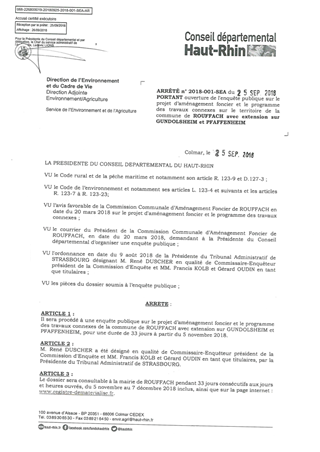 portant ouverture de l'enquête publique sur le projet d'aménagement foncier et le programme des travaux connexes sur le territoire de la commune de ROUFFACH avec extension sur GUNDOLSHEIM et PFAFFENHEIM Resumé Pièces jointes ARRETE Assemblée : Non défini Date : 25/09/2018 Rapporteur : Non défini Collectivité : Conseil départemental du Haut-Rhin Direction : Non défini Service : Direction de l'Environnement et du Cadre de Vie Domaine : Autres (non classés) Commission :