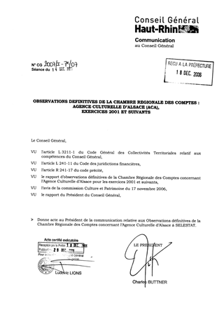 COMMUNICATION. Observations définitives de la Chambre Régionales des Comptes : Agence Culturelle d'Alsace (ACA), exercice 2001 et suivants