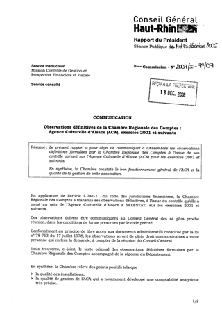 Le présent rapport a pour objet de communiquer à l’Assemblée les observations définitives formulées par la Chambre Régionale des Comptes à l’issue de son contrôle portant sur l’Agence Culturelle d’Alsace (ACA) pour les exercices 2001 et suivants. En synthèse, la Chambre constate le bon fonctionnement général de l’ACA et la qualité de la gestion de cette association.