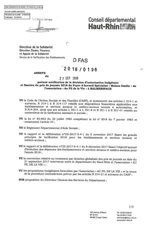 portant notification de la décision d'autorisation budgétaire et fixation du prix de journée 2018 du foyer d'accueil spécialisé "Maison Emilie" de l'association "Au Fil de la Vie" à MALMERSPACH Resumé Pièces jointes ARRETE Assemblée : Non défini Date : 27/09/2018 Rapporteur : Non défini Collectivité : Conseil départemental du Haut-Rhin Direction : Non défini Service : Direction de la Solidarité Domaine : Prix de Journée Commission :
