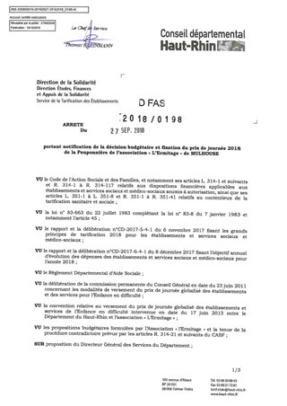 portant notification de la décision d'autorisation budgétaire fixation du prix de journée 2018 de la pouponnière de l'association "L'Ermitage" de MULHOUSE Resumé Pièces jointes ARRETE Assemblée : Non défini Date : 27/09/2018 Rapporteur : Non défini Collectivité : Conseil départemental du Haut-Rhin Direction : Non défini Service : Direction de la Solidarité Domaine : Prix de Journée Commission :