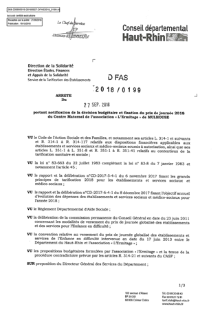 portant notification de la décision d'autorisation budgétaire fixation du prix de journé 2018 du centre maternel de l'association "L'Ermitage" de MULHOUSE Resumé Pièces jointes ARRETE Assemblée : Non défini Date : 27/09/2018 Rapporteur : Non défini Collectivité : Conseil départemental du Haut-Rhin Direction : Non défini Service : Direction de la Solidarité Domaine : Prix de Journée Commission :