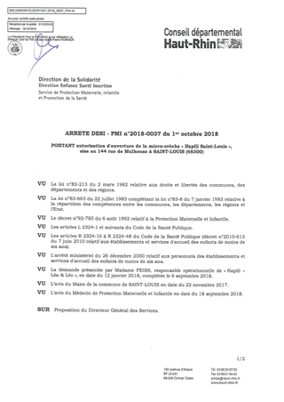 portant autorisation d'ouverture de la micro-crèche "Hapili Saint-Louis", sise au 144 rue de Mulhouse à SAINT-LOUIS (68300) Resumé Pièces jointes ARRETE Assemblée : Non défini Date : 01/10/2018 Rapporteur : Non défini Collectivité : Conseil départemental du Haut-Rhin Direction : Non défini Service : Direction de la Solidarité Domaine : Accueil d'enfants Commission :