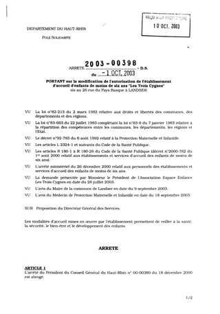 portant sur la modification de l'autorisation de l'établissement d'accueil d'enfants de moins de six ans "Les Trois Cygnes" sis au 26 rue du Pays Basque à LANDSER. Resumé Pièces jointes ARRETE Assemblée : Non défini Date : 01/10/2003 Rapporteur : Non défini Collectivité : Conseil départemental du Haut-Rhin Direction : Non défini Service : Service du Patrimoine et du droit des Sols Domaine : Accueil d'enfants Commission :