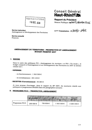 Aménagement du territoire - prospective et aménagement. BP 2007