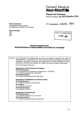 Les interventions du Département en faveur du tourisme concernent les aides à l’hébergement, la restauration, les autres investissements touristiques ainsi que les cotisations, subventions de soutien aux organismes à vocation touristique et autres, le projet de rénovation de la Maison de l’Alsace ainsi que le soutien au Bioscope. Il vous est proposé d’inscrire : Programme F 041 Promotion touristique En investissement : * Une autorisation de programme à hauteur de 1 310 000 € * Un crédit de paiement de 2 658 080 €