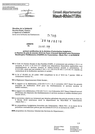 portant notification de la décision d'autorisation budgétaire et fixation du prix de journée 2018 du foyer d'accueil spécialisé pour personnes handicapées vieillissantes (FASPHV) de l'association "Marie Pire" à ALTKIRCH Resumé Pièces jointes ARRETE Assemblée : Non défini Date : 29/10/2018 Rapporteur : Non défini Collectivité : Conseil départemental du Haut-Rhin Direction : Non défini Service : Direction Ressources Solidarité Domaine : Prix de Journée Commission :