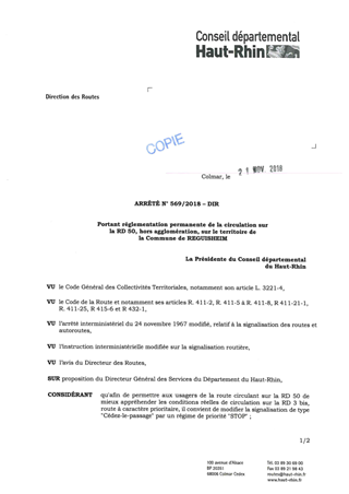 portant réglementation permanente de la circulation sur la RD 50, hors agglomération, sur le territoire de la commune de REGUISHEIM Resumé Pièces jointes ARRETE Assemblée : Non défini Date : 21/11/2018 Rapporteur : Non défini Collectivité : Conseil départemental du Haut-Rhin Direction : Non défini Service : Direction des Routes Domaine : Circulation Commission :