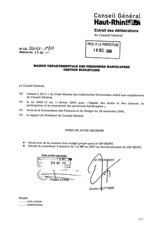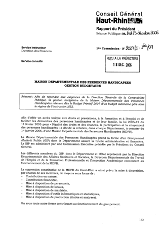Afin de répondre aux exigences de la Direction Générale de la Comptabilité Publique, la gestion budgétaire de la Maison Départementale des Personnes Handicapées relèvera dès le Budget Primitif 2007 d’un budget autonome géré sous le régime de l’instruction M52.