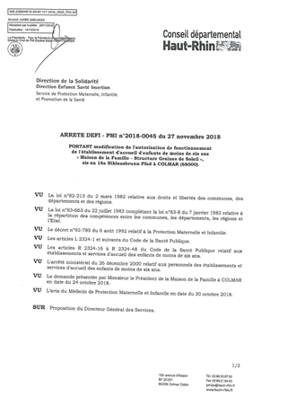 portant modification de l'autorisation de fonctionnement de l'établissement d'accueil d'enfants de moins de six ans "Maison de la Famille - Structure Graines de Soleil", sis au 16a Niklausbrunn Pfad à COLMAR (68000) Resumé Pièces jointes ARRETE Assemblée : Non défini Date : 27/11/2018 Rapporteur : Non défini Collectivité : Conseil départemental du Haut-Rhin Direction : Non défini Service : Direction Enfance Famille Insertion Domaine : Accueil d'enfants Commission :