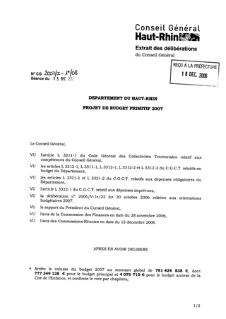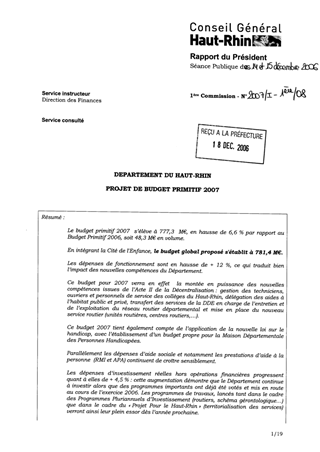 Département du Haut-Rhin. Projet de Budget primitif 2007