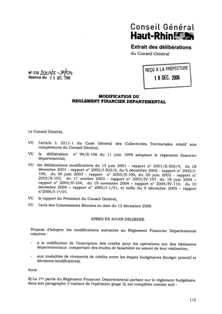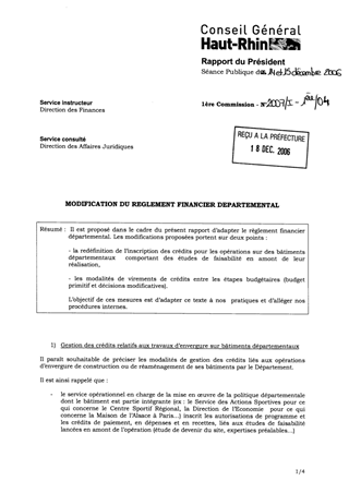 Il est proposé dans le cadre du présent rapport d’adapter le règlement financier départemental. Les modifications proposées portent sur deux points : - la redéfinition de l’inscription des crédits pour les opérations sur des bâtiments départementaux comportant des études de faisabilité en amont de leur réalisation, - les modalités de virements de crédits entre les étapes budgétaires (budget primitif et décisions modificatives). L’objectif de ces mesures est d’adapter ce texte à nos pratiques et d’alléger nos procédures internes.
