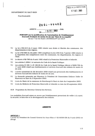 portant sur la modification de l'autorisation de l'établissement d'accueil d'enfants de moins de six ans "Sors de ta coquille" sis au 7 rue du Stade à BURNHAUPT LE HAUT. Resumé Pièces jointes ARRETE Assemblée : Non défini Date : 09/10/2003 Rapporteur : Non défini Collectivité : Conseil départemental du Haut-Rhin Direction : Non défini Service : Direction de la Solidarité Domaine : Accueil d'enfants Commission :