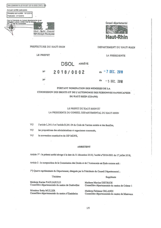 portant nomination des membres de la commission des droits et de l'autonomie des personnes handicapées du Haut-Rhin (CDAPH) Resumé Pièces jointes ARRETE Assemblée : Non défini Date : 07/12/2018 Rapporteur : Non défini Collectivité : Conseil départemental du Haut-Rhin Direction : Non défini Service : DGA Développement Humain et Solidarité Domaine : Autres (non classés) Commission :