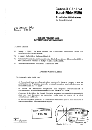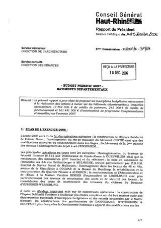 Le présent rapport a pour objet de proposer les inscriptions budgétaires nécessaires à la réalisation des actions à mener sur les bâtiments départementaux, lesquelles nécessiteront 13 469 500 € de crédits de paiement, 245 000 € de crédits de fonctionnement et 101 441 000 € d’autorisations de programme (complémentaires et nouvelles) sur l’exercice 2007.