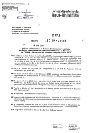 portant notification de la décision d'autorisation budgétaire et portant financement des prestations afférentes à la dépendance de l'EHPAD "Saint-Anne" à HEIMSBRUNN pour l'année 2019 Resumé Pièces jointes ARRETE Assemblée : Non défini Date : 16/01/2019 Rapporteur : Non défini Collectivité : Conseil départemental du Haut-Rhin Direction : Non défini Service : DGA Développement Humain et Solidarité Domaine : Dotations financières Commission :