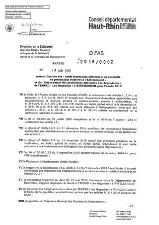 portant fixation des "tarifs journaliers afféents à un ensemble de prestations relatives à l'hébergement" et du "financement des prestations afférentes à la dépendance" de l'EHPAD "Les Magnolias" à WINTZENHEIM pour l'année 2019 Resumé Pièces jointes ARRETE Assemblée : Non défini Date : 16/01/2019 Rapporteur : Non défini Collectivité : Conseil départemental du Haut-Rhin Direction : Non défini Service : DGA Développement Humain et Solidarité Domaine : Prix de Journée Commission :