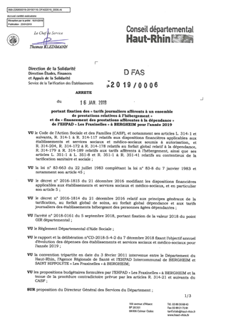 portant fixation des "tarifs journaliers afférents à un ensemble de prestations relatives à l'hébergement" et du "financement des prestations afférentes à la dépendance" de l'EHPAD "Les Fraxinelles" à BERGHEIM pour l'année 2019 Resumé Pièces jointes ARRETE Assemblée : Non défini Date : 16/01/2019 Rapporteur : Non défini Collectivité : Conseil départemental du Haut-Rhin Direction : Non défini Service : DGA Développement Humain et Solidarité Domaine : Prix de Journée Commission :