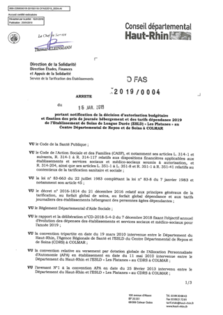 portant modification de la décision d'autorisation budgétaire et fixation des prix de journée hébergement et des tarifs dépendance 2019 de l'établissement de soins de longue durée (ESLD) "Les Platanes" au centre départemental de repos et de soins à COLMAR