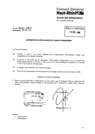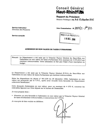 Le Département a été saisi par le Trésorier Payeur Général du Haut-Rhin sur l’admission en non valeur de taxes d’urbanisme d’un montant de 4 070,00 € qui s’avèrent irrécouvrables. Cette admission ne fait pas l’objet d’une inscription au budget