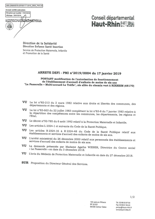 portant modification de l'autorisation de fonctionnement de l'établissement d'accueil d'enfants de moins de six ans "La Passerelle - multi-accueil Le Trèfle", sis allée du chemin vert à RIXHEIM (68170) Resumé Pièces jointes ARRETE Assemblée : Non défini Date : 17/01/2019 Rapporteur : Non défini Collectivité : Conseil départemental du Haut-Rhin Direction : Non défini Service : DGA Développement Humain et Solidarité Domaine : Accueil d'enfants Commission :