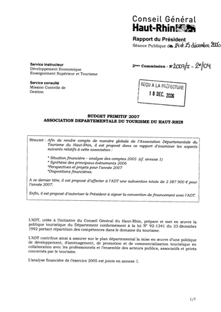 Afin de rendre compte de manière globale de l’Association Départementale du Tourisme du Haut-Rhin, il est proposé dans ce rapport d’examiner les aspects suivants relatifs à cette association : * Situation financière – analyse des comptes 2005 (cf. annexe 1) * Synthèse des principaux évènements 2006 *Perspectives et projets pour l’année 2007 *Dispositions financières. A ce dernier titre, il est proposé d’affecter à l’ADT une subvention totale de 2 387 900 € pour l’année 2007. Enfin, il est proposé d’autoriser le Président à signer la convention de financement avec l’ADT.