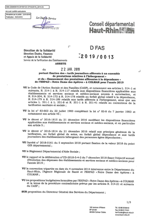 portant fixation des "tarifs journaliers afférents à un ensemble de prestations relatives à l'hébergement" et du "financement des prestations afférentes à la dépendance" de l'EHPAD "Notre Dame des Apôtres" à COLMAR pour l'année 2019 Resumé Pièces jointes ARRETE Assemblée : Non défini Date : 22/01/2019 Rapporteur : Non défini Collectivité : Conseil départemental du Haut-Rhin Direction : Non défini Service : DGA Développement Humain et Solidarité Domaine : Prix de Journée Commission :