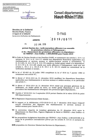 portant fixation des "tarifs journaliers afférents à un ensemble de prestations relatives à l'hébergement" et du "financement des prestations afférentes à la dépendance" de l'EHPAD "Jean Dollfus" à MULHOUSE pour l'année 2019 Resumé Pièces jointes ARRETE Assemblée : Non défini Date : 22/01/2019 Rapporteur : Non défini Collectivité : Conseil départemental du Haut-Rhin Direction : Non défini Service : DGA Développement Humain et Solidarité Domaine : Prix de Journée Commission :