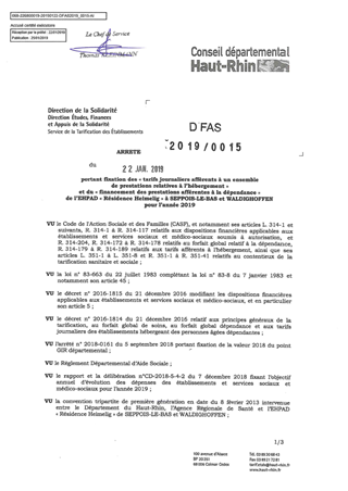 portant fixation "des tarifs journaliers afférents à un ensemble de prestations relatives à l'hébergement" et du "financement des prestations afférentes à la dépendance" de l'EHPAD "Résidence Heimelig" à SEPPOIS-LE-BAS et WALDIGHOFFEN pour l'année 2019