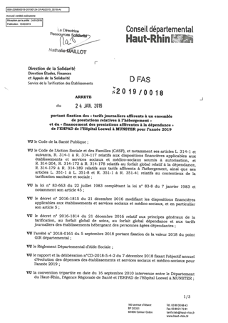 portant fixation des "tarifs journaliers afférents à un ensemble de prestations relatives à l'hébergement" et du "financement des prestations afférentes à la dépendance" de l'EHPAD de l'hôpital Loewel à MUNSTER pour l'année 2019 Resumé Pièces jointes ARRETE Assemblée : Non défini Date : 24/01/2019 Rapporteur : Non défini Collectivité : Conseil départemental du Haut-Rhin Direction : Non défini Service : DGA Développement Humain et Solidarité Domaine : Prix de Journée Commission :