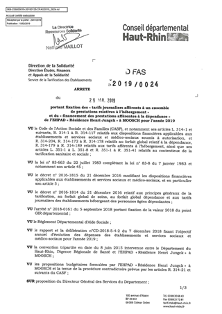 portant fixation des "tarifs journaliers afférents à un ensemble de prestations relatives à l'hébergement" et du "financement des prestations afférentes à la dépendance" de l'EHPAD "Résidence Henri Jungck" à MOOSCH pour l'année 2019 Resumé Pièces jointes ARRETE Assemblée : Non défini Date : 29/01/2019 Rapporteur : Non défini Collectivité : Conseil départemental du Haut-Rhin Direction : Non défini Service : DGA Développement Humain et Solidarité Domaine : Prix de Journée Commission :