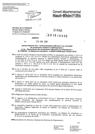 portant fixation des "tarifs journaliers afférents à un ensemble de prestations relatives à l'hébergement" et du "financement des prestations afférentes à la dépendance" de l'EHPAD "La Maison du Lertzbach" à SAINT LOUIS pour l'année 2019 Resumé Pièces jointes ARRETE Assemblée : Non défini Date : 29/01/2019 Rapporteur : Non défini Collectivité : Conseil départemental du Haut-Rhin Direction : Non défini Service : DGA Développement Humain et Solidarité Domaine : Prix de Journée Commission :