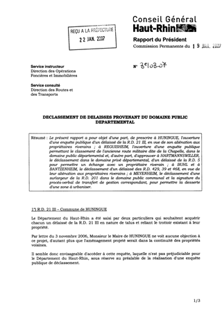 Le présent rapport a pour objet d'une part, de prescrire à HUNINGUE, l'ouverture d'une enquête publique d'un délaissé de la R.D. 21 III, en vue de son aliénation aux propriétaires riverains ; à REGUISHEIM, l'ouverture d'une enquête publique permettant le classement de l'ancienne route militaire dite de la Chapelle, dans le domaine public départemental et, d'autre part, d'approuver à HARTMANNSWILLER, le déclassement dans le domaine privé départemental, d'un délaissé de la R.D. 5 pour permettre un échange avec un propriétaire riverain ; à BUHL et à BANTZENHEIM, le déclassement d'un délaissé des R.D. 429, 39 et 468, en vue de leur aliénation aux propriétaires riverains ; à MEYENHEIM, le déclassement d'une surlargeur de la R.D. 201 dans le domaine public communal et la signature du procès-verbal de transfert de gestion correspondant, pour permettre la desserte d'une zone à urbaniser.