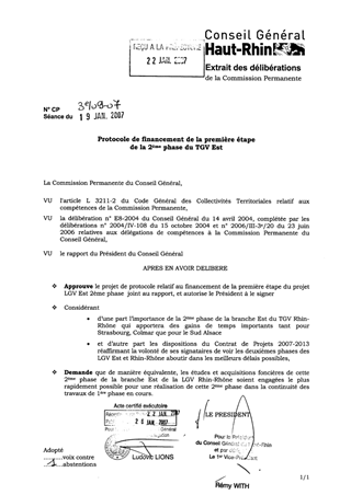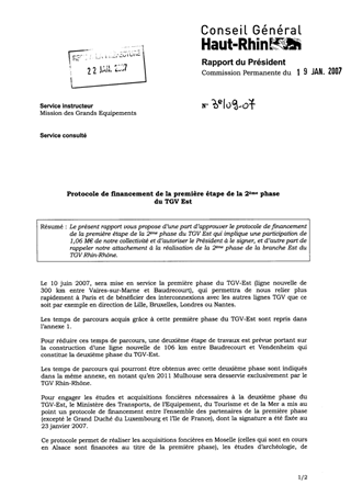 Le présent rapport vous propose d’une part d’approuver le protocole de financement de la première étape de la 2ème phase du TGV Est qui implique une participation de 1,06 M€ de notre collectivité et d’autoriser le Président à le signer, et d’autre part de rappeler notre attachement à la réalisation de la 2ème phase de la branche Est du TGV Rhin-Rhône.