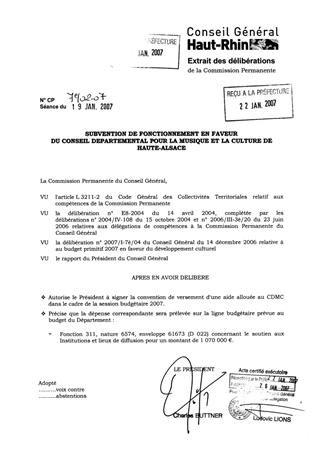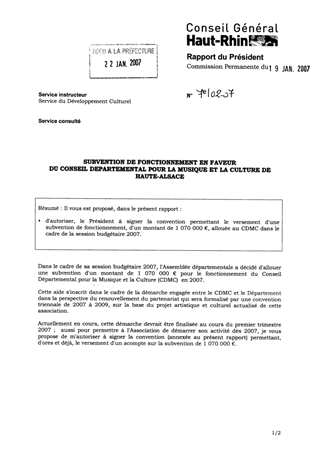 Il vous est proposé, dans le présent rapport :  d'autoriser, le Président à signer la convention permettant le versement d'une subvention de fonctionnement, d'un montant de 1 070 000 €, allouée au CDMC dans le cadre de la session budgétaire 2007.
