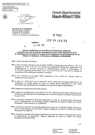 portant notification de la décision d'autorisation budgétaire et fixation des prix de journée hébergement et des tarifs dépendance 2019 de l'établissement de soins de longue durée (ESLD) du groupe hospitalier de la région de Mulhouse et Sud Alsace (GHRMSA