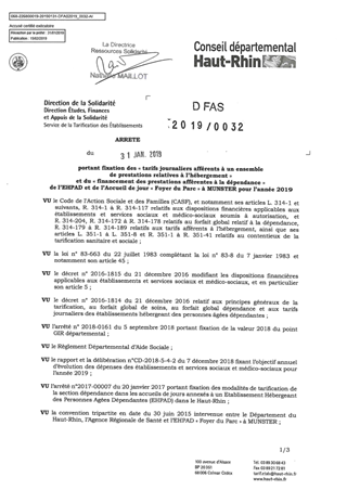 portant fixation des "tarifs journaliers afférents à un ensemble de prestations relatives à l'hébergement" et du "financement des prestations afférentes à la dépendance" de l'EHPAD et de l'accueil de jour "Foyer du Parc" à MUNSTER pour l'année 2019 Resumé Pièces jointes ARRETE Assemblée : Non défini Date : 31/01/2019 Rapporteur : Non défini Collectivité : Conseil départemental du Haut-Rhin Direction : Non défini Service : DGA Développement Humain et Solidarité Domaine : Prix de Journée Commission :