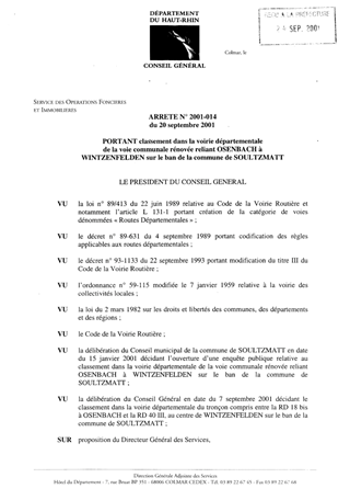 Portant classement dans la voirie départmentale de la voie communale rénovée reliant OSENBACH à WINTZENFELDEN sur le ban de la commune de SOULTZMATT Resumé Pièces jointes ARRETE Assemblée : Non défini Date : 20/09/2001 Rapporteur : Non défini Collectivité : Conseil départemental du Haut-Rhin Direction : Non défini Service : Service du Patrimoine et du droit des Sols Domaine : Déclassement de voirie Commission :