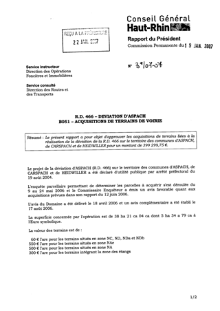 Le présent rapport a pour objet d'approuver les acquisitions de terrains liées à la réalisation de la déviation de la R.D. 466 sur le territoire des communes d'ASPACH, de CARSPACH et de HEIDWILLER pour un montant de 399 299,75 €.