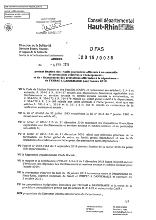 portant fixation des "tarifs journaliers afférents à un ensemble de prestations relatives à l'hébergement" et du "financement des prestations afférentes à la dépendance" de l'EHPAD à DANNEMARIE pour l'année 2019 Resumé Pièces jointes ARRETE Assemblée : Non défini Date : 04/02/2019 Rapporteur : Non défini Collectivité : Conseil départemental du Haut-Rhin Direction : Non défini Service : DGA Développement Humain et Solidarité Domaine : Prix de Journée Commission :