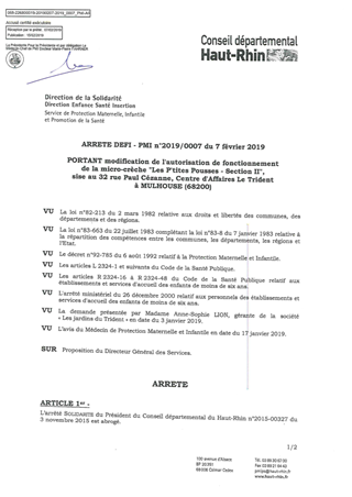 portant modification de l'autorisation de fonctionnement de la micro-crèche "Les P'tites Pousses - Section II", sise au 32 rue Paul Cézanne, Centre d'Affaires le Trident à MULHOUSE (68200) Resumé Pièces jointes ARRETE Assemblée : Non défini Date : 07/02/2019 Rapporteur : Non défini Collectivité : Conseil départemental du Haut-Rhin Direction : Non défini Service : DGA Développement Humain et Solidarité Domaine : Accueil d'enfants Commission :