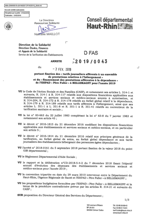 portant fixation des "tarifs journaliers afférents à un ensemble de prestations relatives à l'hébergement" et du "financement des prestations afférentes à la dépendance" de l'EHPAD "Père Faller" à BELLEMAGNY pour l'année 2019 Resumé Pièces jointes ARRETE Assemblée : Non défini Date : 07/02/2019 Rapporteur : Non défini Collectivité : Conseil départemental du Haut-Rhin Direction : Non défini Service : DGA Développement Humain et Solidarité Domaine : Prix de Journée Commission :