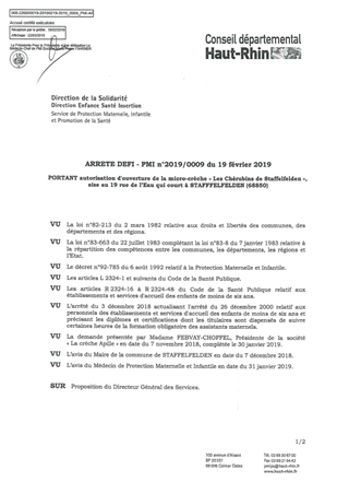 portant autorisation d'ouverture de la micro-crèche "Les Chérubins de Staffelfelden", sise au 19 rue de l'Eau qui court à STAFFELFELDEN (68850) Resumé Pièces jointes ARRETE Assemblée : Non défini Date : 19/02/2019 Rapporteur : Non défini Collectivité : Conseil départemental du Haut-Rhin Direction : Non défini Service : DGA Développement Humain et Solidarité Domaine : Accueil d'enfants Commission :