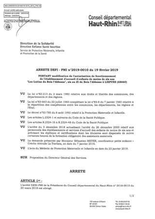 portant modification de l'autorisation de fonctionnement de l'établissement d'accueil d'enfants de moins de six ans "Les Lutins du Bois l'Abbesse", sis au ZI de Bois l'Abbesse à LIEPVRE (68660) Resumé Pièces jointes ARRETE Assemblée : Non défini Date : 19/02/2019 Rapporteur : Non défini Collectivité : Conseil départemental du Haut-Rhin Direction : Non défini Service : DGA Développement Humain et Solidarité Domaine : Accueil d'enfants Commission :